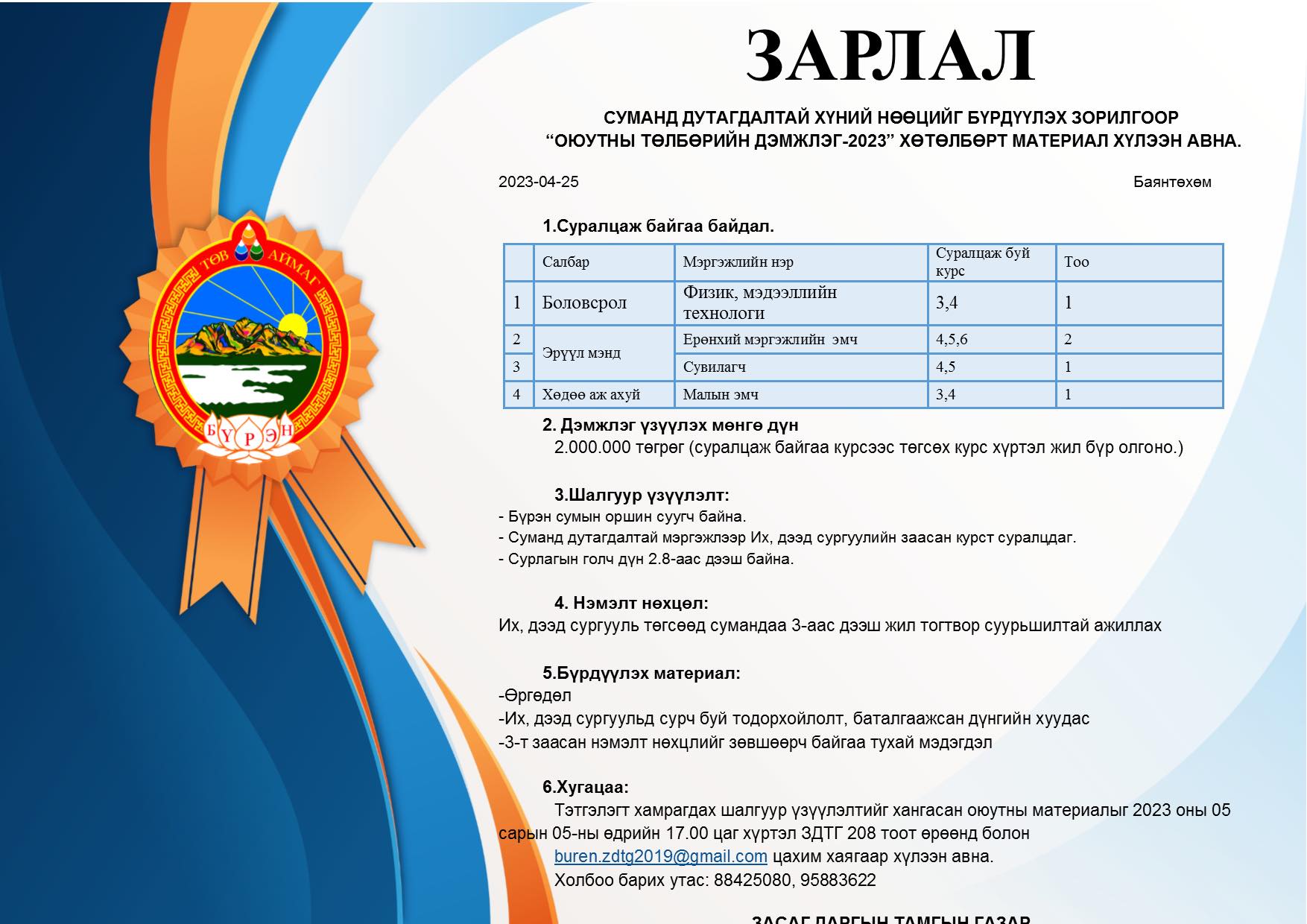 СУРГАЛТЫН ТӨЛБӨРИЙН ДЭМЖЛЭГ-2023